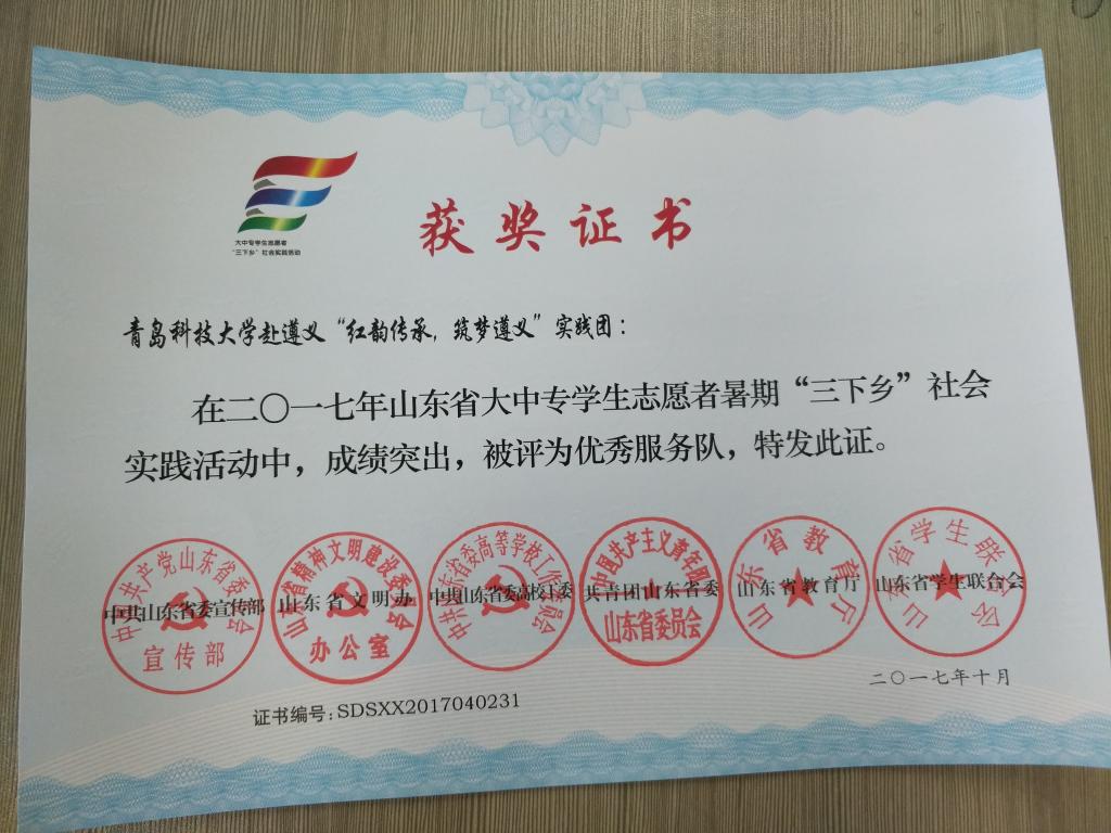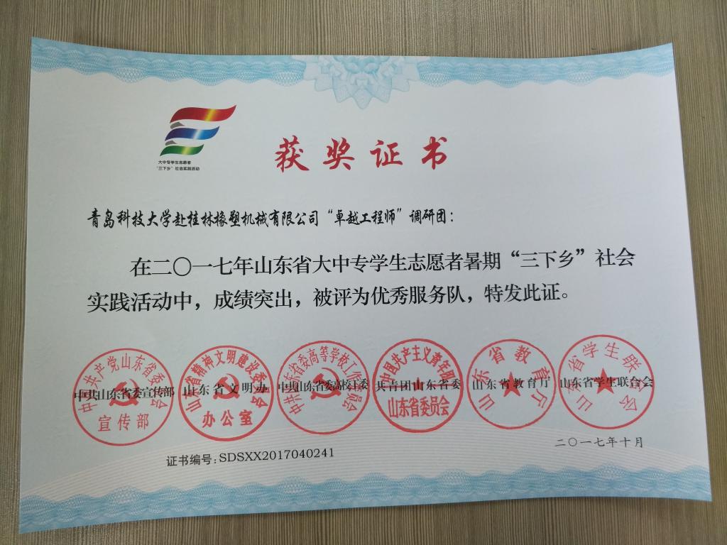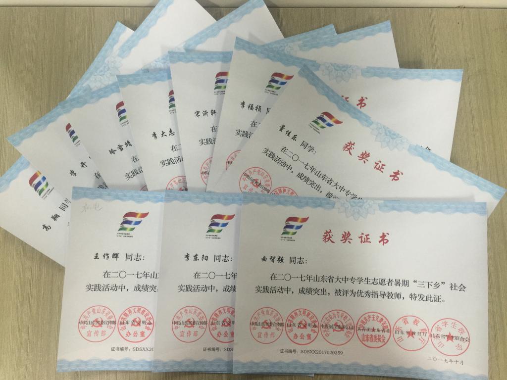 近日,2017年山东省大中专学生志愿者暑期文化科技卫生“三下乡”社会实践活动先进集体和先进个人的证书下发,威廉希尔官网 赴桂林橡塑机械有限公司“卓越工程师”调研团、赴遵义“红韵传承,筑梦遵义”实践团2支队伍获得2017年山东省优秀服务队称号,王作辉、曲智强、李东阳被评为2017年山东省社会实践活动优秀指导教师,高翔、李开、冷雪靖、李大志、宋沂轩、李福祯、董佳乐7名学生荣获2017年山东省社会实践活动优秀学生。