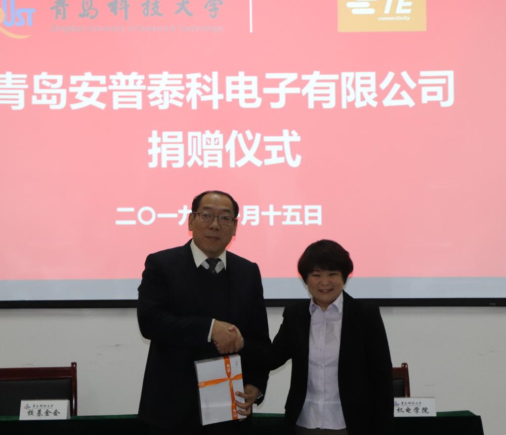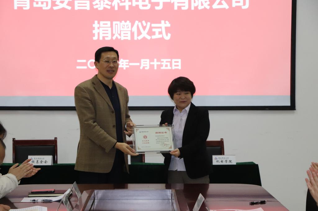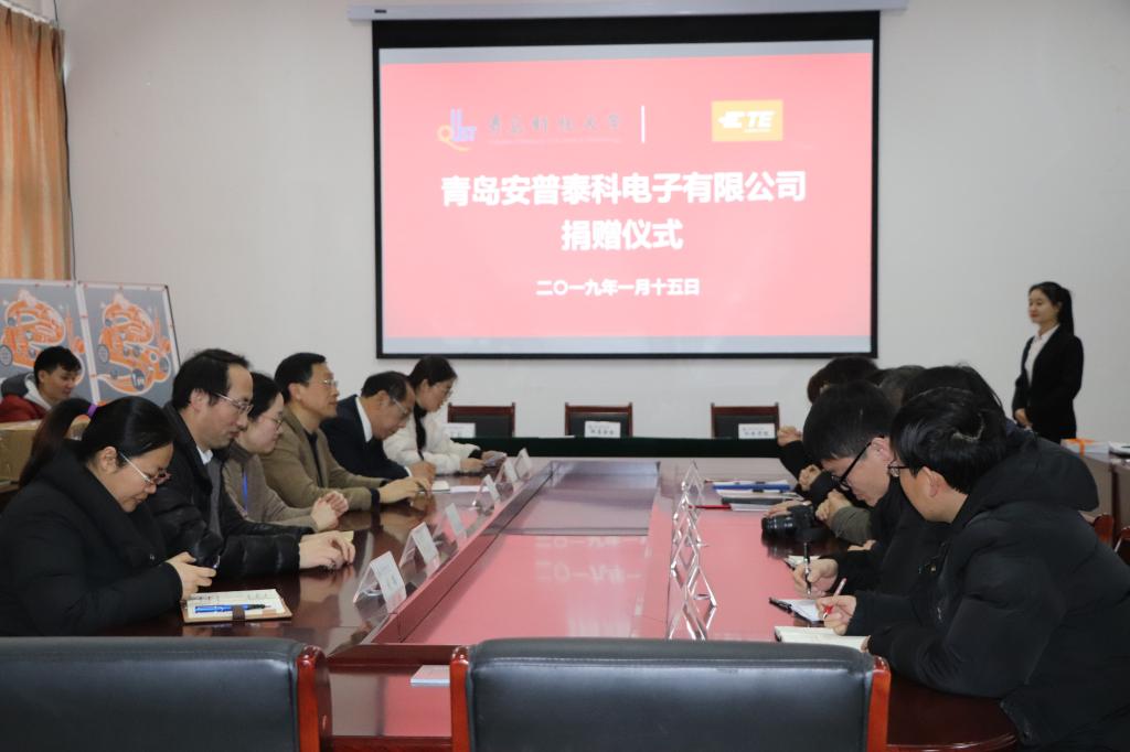 1月15日上午,青岛安普泰科电子有限公司捐赠仪式在机电大楼518会议室隆重举行。校友办主任兼教育发展基金会秘书长聂广明、威廉希尔官网