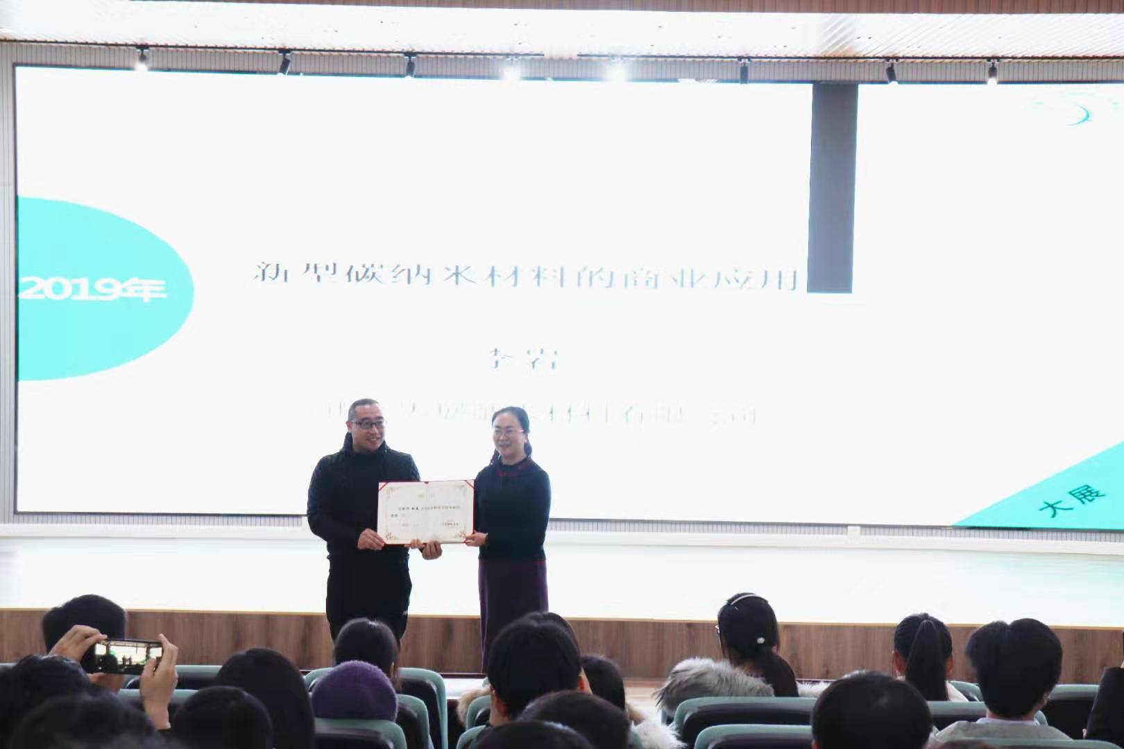 李岩作了题为《新型碳纳米材料的商业应用》的学术报告,报告中他讲述了碳纤维、富勒烯、石墨炔、石墨烯、碳纳米管五种新型碳材料的发展现状。并从投资和运营的角度,思考如何将技术开发与市场开拓、企业运营高效结合。指出碳纳米管等低维碳纳米材料具有高导电、高导热和优异的力学性能等特点,应用前景十分广阔,可广泛应用于新能源、生物医药、半导体及各类增强材料(如塑料、橡胶、涂料、水泥、电缆、导电剂、合金、轮胎等)。