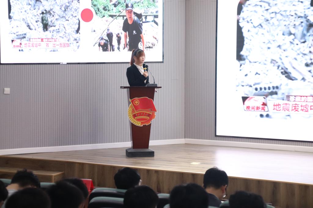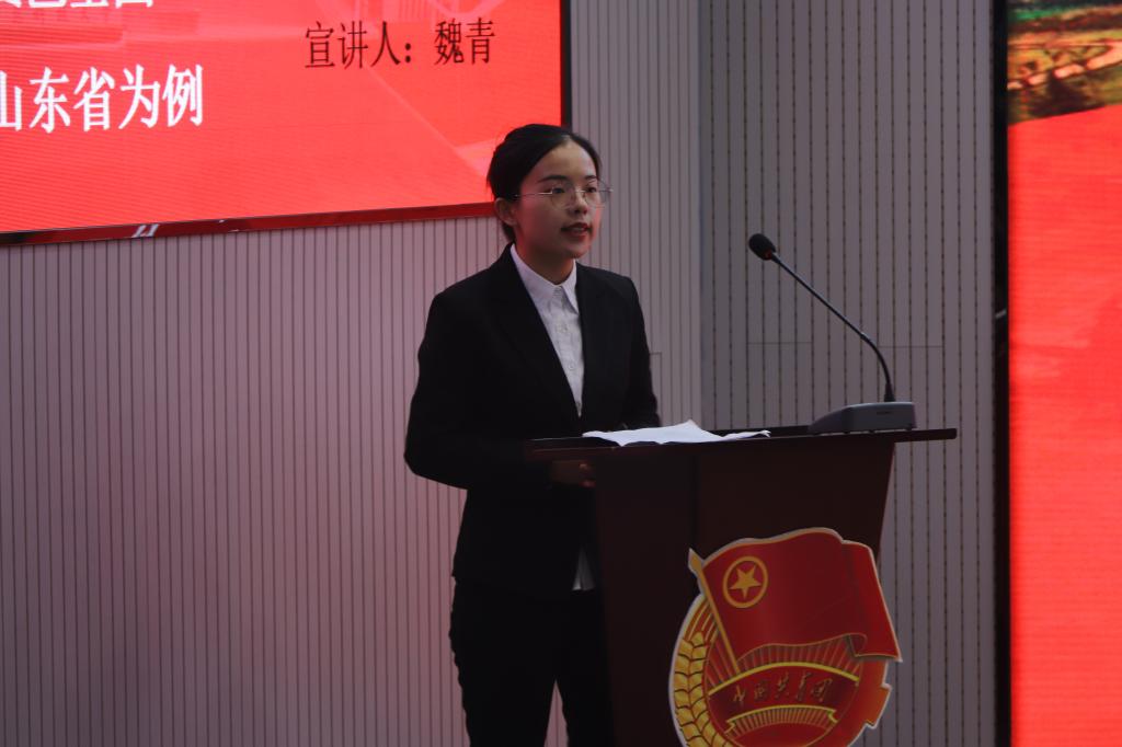 “习近平新时代中国特色社会主义思想宣讲团”成员魏青和李晶晶分别作了题为《讲好红色故事 传承红色基因》、《五星红旗背后的故事》的理论宣讲。同学们一起赏析观看了《红星照耀中国》。