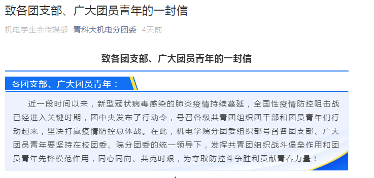 分团委组织部发表《致各团支部、广大团员的一封信》,号召各团支部、广大团员青年要坚持在校团委、院分团委的统一领导下,发挥共青团组织战斗堡垒作用和团员青年先锋模范作用,同心同向、共克时艰,为夺取防控斗争胜利贡献青春力量!号召机电学子服从指挥有纪律、正确发声有作为、履行职责有担当、网络学习由效率。威廉希尔官网