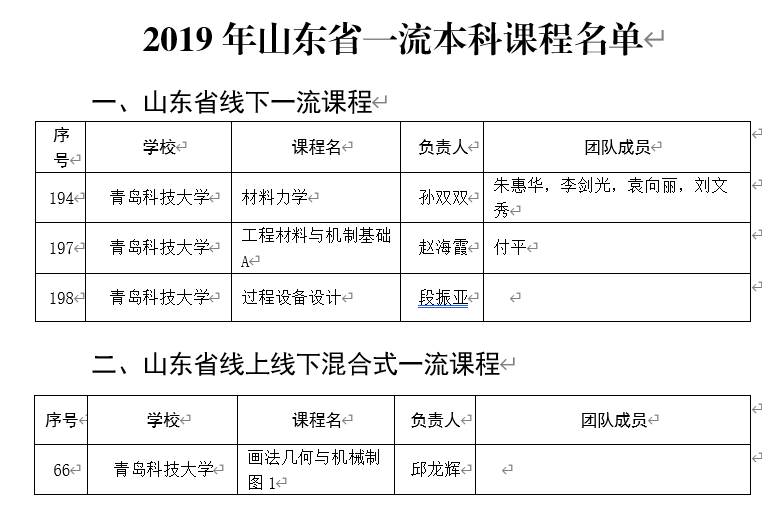 多门课程入选2019年山东省一流本科,数量居于全校前列。其中,山东省线下一流课程三门:分别是孙双双、朱惠华、李剑光、袁向丽、刘文秀团队《材料力学》,赵海霞、付平《工程材料与机制基础A》,段振亚《过程设备设计》。线上线下混合式一流课程一门:邱龙辉《画法几何与机械制图1》。
