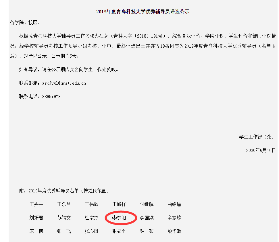 近期,2019年度青岛科技大学优秀辅导员名单公布,我院李东阳老师名列其中。据悉,此次评选是根据《青岛科技大学辅导员工作考核办法》(青科大字﹝2018〕191号),综合自我评价、威廉希尔官网