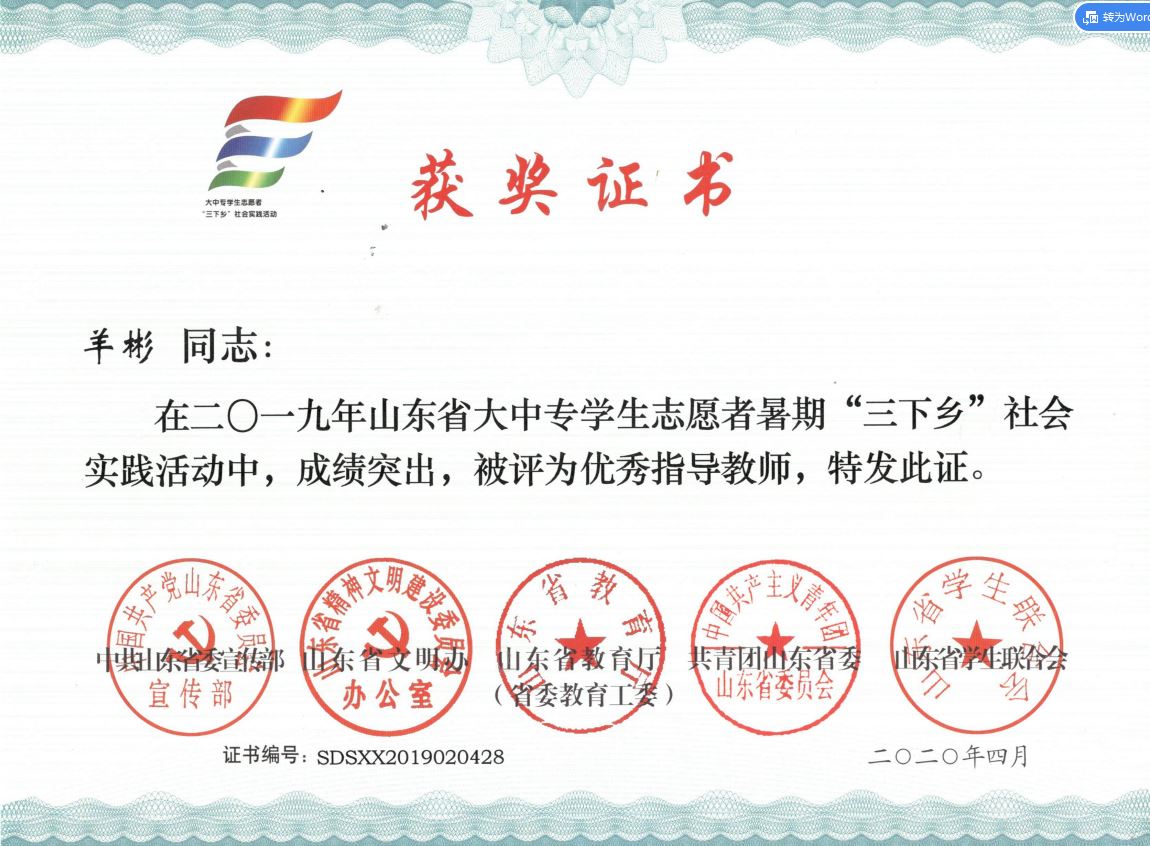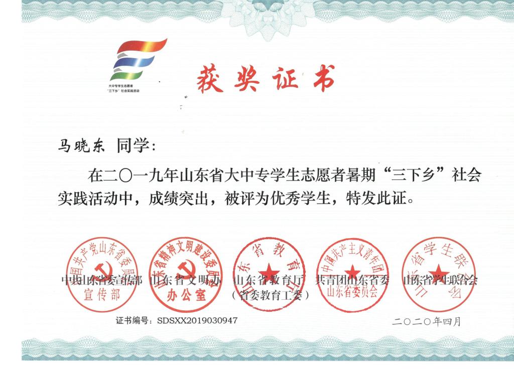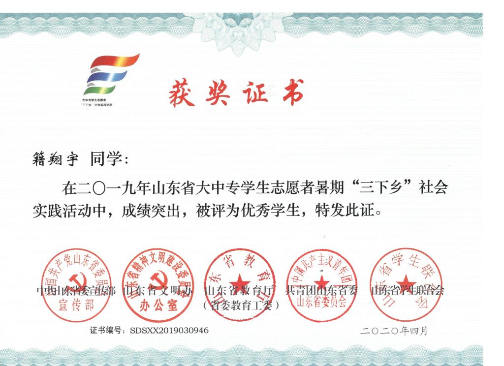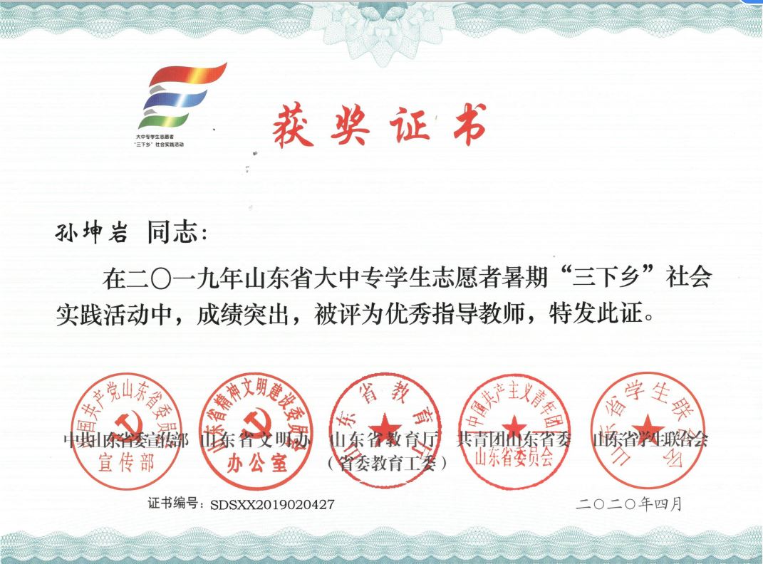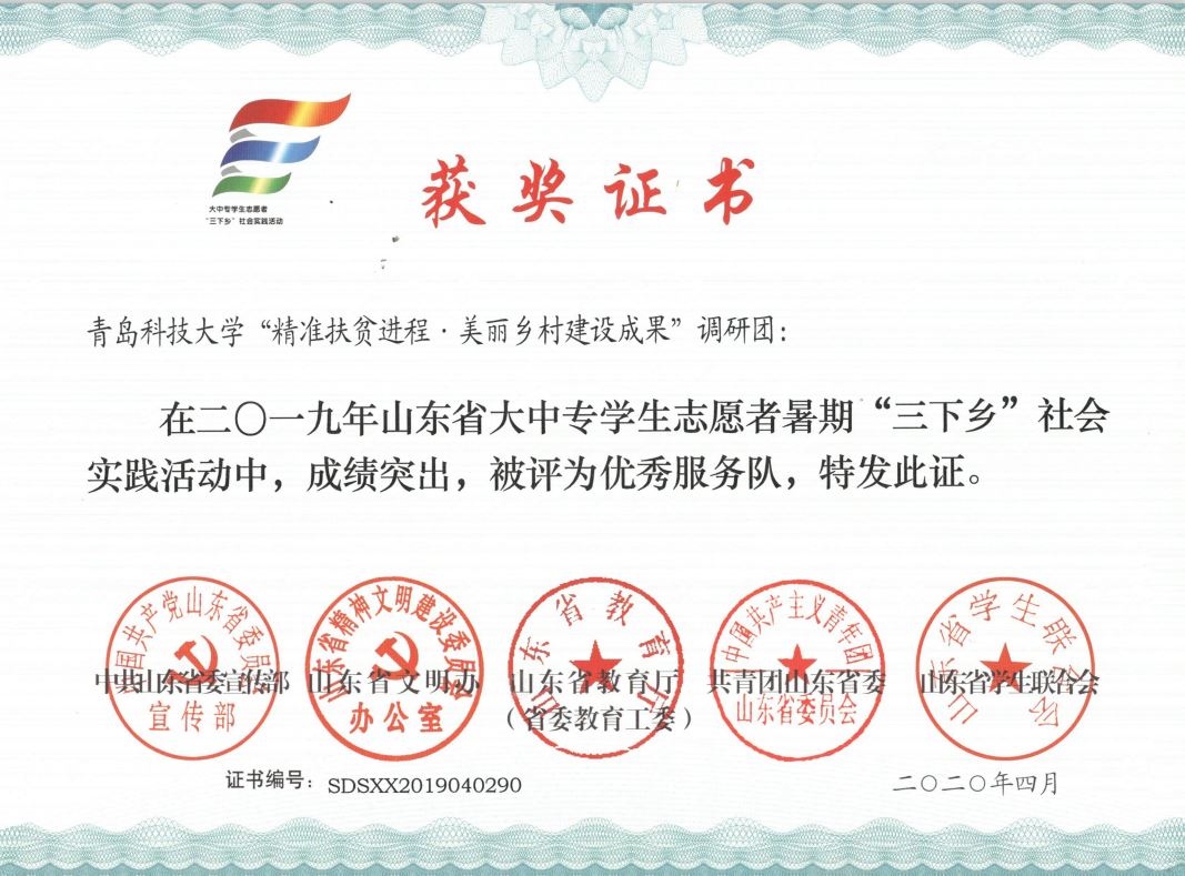 近日,2019年山东省大中专学生志愿者暑期文化科技卫生“三下乡”社会实践活动先进集体和先进个人的证书下发,威廉希尔官网 “青岛科技大学精准扶贫进程 美丽乡村建设成果”调研团、获“三下乡”省级优秀服务团队,孙坤岩、羊彬获“三下乡”社会实践活动优秀指导教师,籍翔宇、张晓楠、范浩然、马晓东获 “三下乡”社会实践优秀学生。