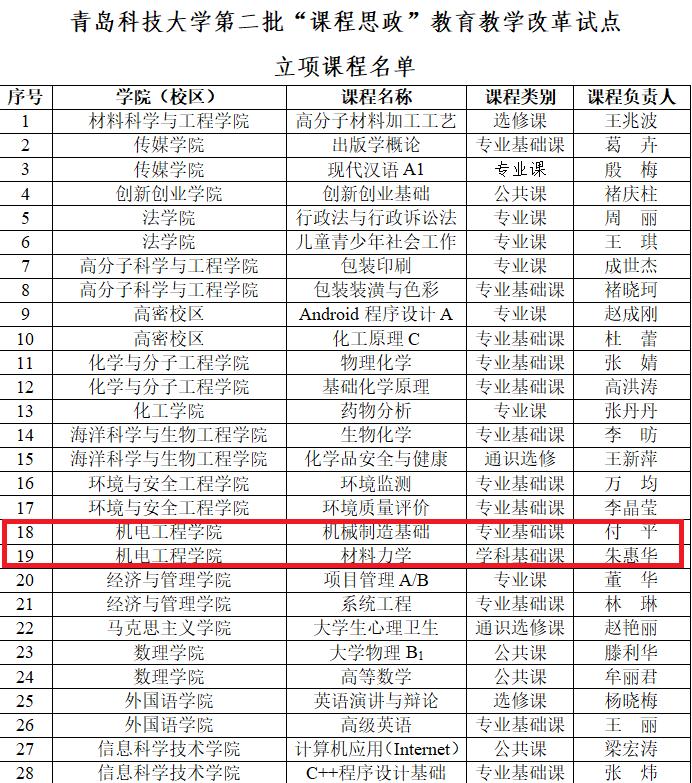 近日,在学校公布的青岛科技大学第二批“课程思政”教育教学改革试点立项课程的通知中,我院付平老师的《机械制造基础》与朱惠华老师的《材料力学》两门课程荣获立项。