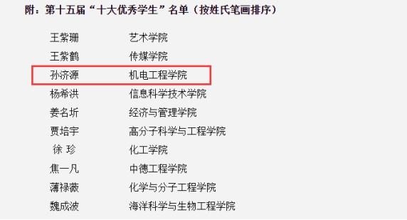 (校区)推荐、资格审核、网络投票、现场汇报、民主投票等环节,现评选公示中,我院孙济源同学获得“十大优秀学生”。