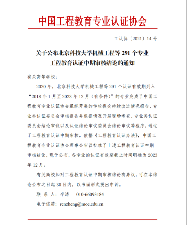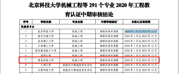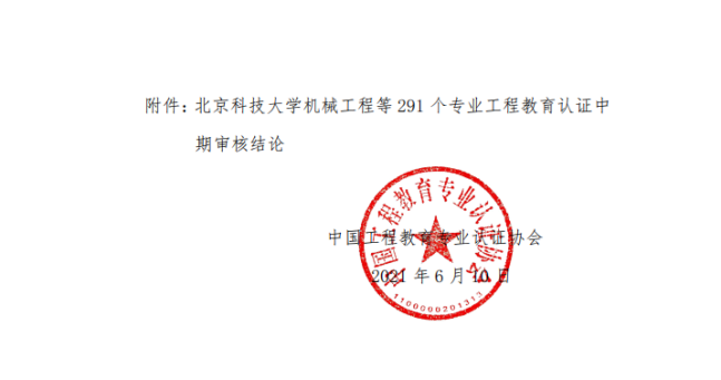 近日,中国工程教育专业认证协会发布了《关于公布北京科技大学机械工程等291个专业工程教育认证中期审核结论的通知》,我院机械工程和过程装备与控制工程两个专业在列,审核结论为“继续保持有效期”,本轮认证有效期为“2018年1月至2023年12月”。