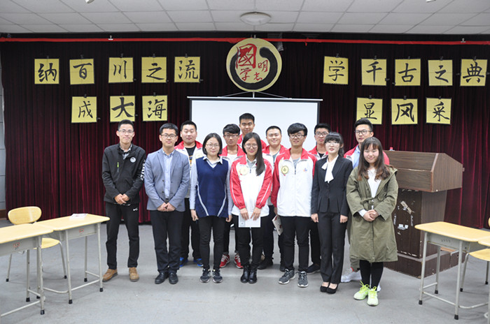 分团委老师、学生会秘书长曲智强,分团委老师杨蕾,国学读书会会长边靖、副会长王帅及威廉希尔官网