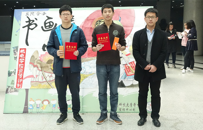 合作主办,所有参选作品共展出两天,并根据展出时的观众投票评选出三等奖六人,二等奖四人及一等奖两人。下午2:00,颁奖典礼正式开始。首先,由各位获奖者对本次书画活动进行了简单的回顾与总结,纷纷表示在此次大赛中收获良多,对自我的定位有了重新的认识,并希望学校可以多举办此类活动,帮助大学生们陶冶情操、修身养性。随后,颁奖环节正式开始,现场逐一揭晓了各个奖项,荣誉证书和奖品都被获奖者揽入怀中,现场气氛十分热烈。最后,曲智强老师对本次比赛作了简单总结,赞叹了参赛者们的高超水平,宣布了此次“书峥嵘岁月,画红色青春”书画展圆满落幕。
