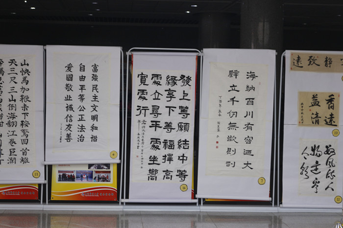 三院在青岛科技大学图书馆二楼合作举办了“书峥嵘岁月,画红色精神”主题书画展活动。